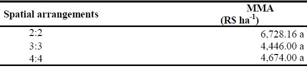 There was no significant interaction between spatial arrangement and population density of cowpea for modified monetary advantage, and there were also no significant differences between spatial arrangements (Table 4). Favacho (2015) in a study of the intercropping of carrot × cowpea as a function of amount of rooster tree biomass and spatial arrangements also showed no significant interaction between the treatments factors studied in the modified monetary advantage. Although there were no significant differences among the arrangements studied, the 2:2 arrangement in absolute terms was superior to the others, presenting an average value of R$ 6,728.10. This behavior can probably be attributed to the low competition in this arrangement.