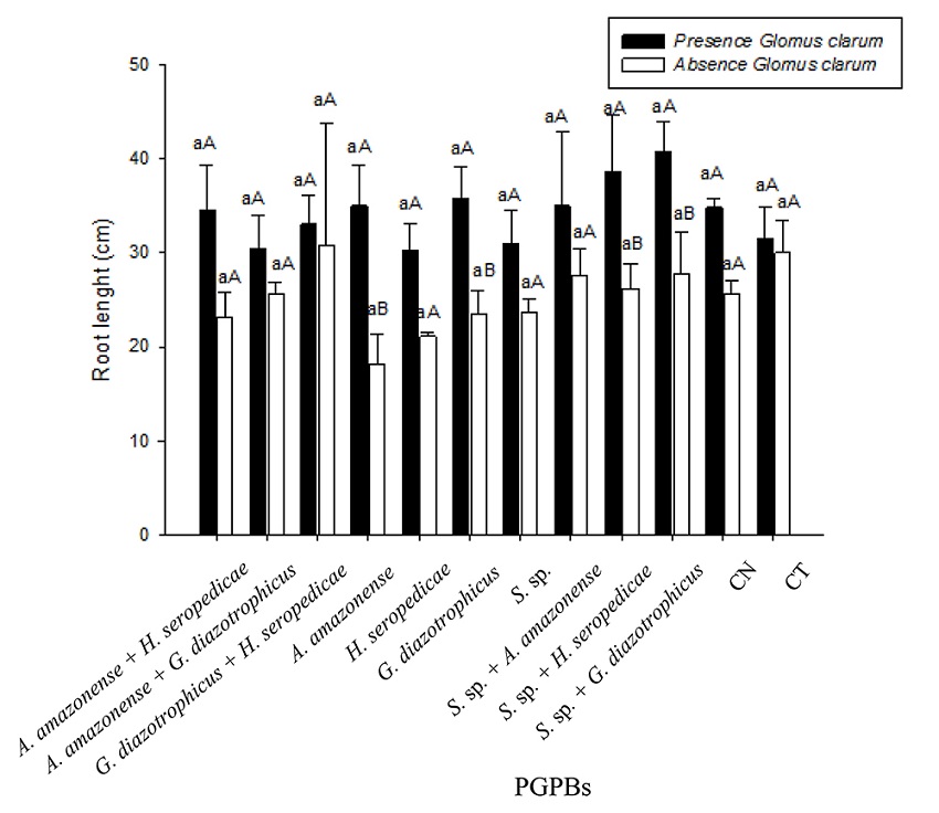 There was no significant difference in root length (Figure 1) for PGPBs when analyzed individually in the presence and absence of AMF. However, there was a significant interaction when the G. clarum was inoculated with the BR 11140 (A. amazonense), BR 11284 (G. diazotrophicus) and when co-inoculated with S30 + BR 11284 (Streptomyces sp. + G. diazotrophicus) and S30 + BR 11175 (Streptomyces sp. + Herbaspirillum seropedicae); these treatments stimulated root growth by 93%, 48% and 46%, respectively, over those plants not inoculated.