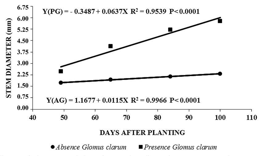Regarding the stem diameter, there was no significant interaction between PGPBs and AMF when assessed at 49 and 100 days after planting (DAP); however, it was significant at 65 (Table 2) and 84 DAP (Table 3). The greatest stem thickness was found when the plant was inoculated with BR 11140 (A. amazonense) (65 DAP) and after double inoculation with S30 + BR 11140 (Streptomyces sp + A. amazonense) (84 DAP), with increases of 40% and 33.6%, respectively, when compared with the nitrogen control (CN). Regression equations (Figure 2) showed that stem diameter increased linearly both in the presence (R2 = 0.95) and absence (R2 = 0.99) of AMF; however, when the plant was inoculated with G. clarum, the stem thickness at 51 days increased by 3.25 mm, whereas it only increased by 0.58 mm in the absence of the fungus.