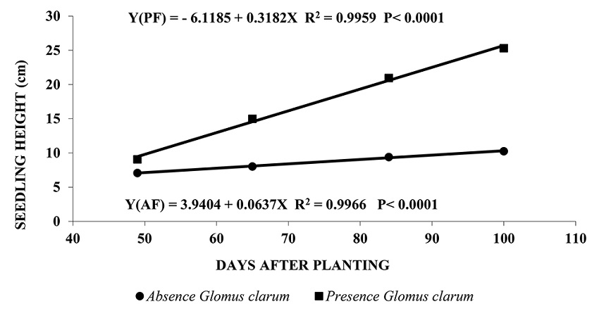 There was no interaction between PGPBs and AMF for plant height during the evaluated timeframes, 49 and 65 DAP (Table 4), 84 and 100 DAP (Table 5), but the plant height increased linearly both in the presence (R2 = 0.99) and in the absence of the fungus (R2 = 0.99). Greater benefits were obtained when inoculated with G. clarum, considering that plants grew 16.23 cm in 51 days, whereas in the absence of the fungus plants only grew 3.25 cm (Figure 3).
