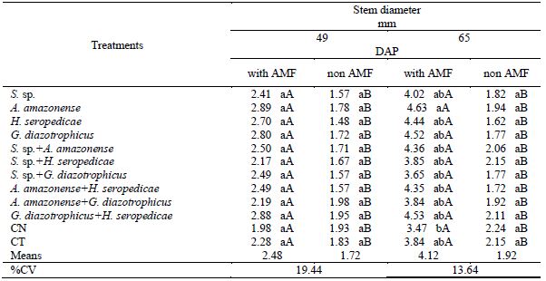 The lack of synergistic responses between PGPBs and AMF was also observed by Lima et al. (2011) in which strains of Stenotrophomonas maltophilia and Azospirillum sp. combined with G. clarum and Gigaspora margarita did not promote stimulatory or suppressive effects on the growth of papaya seedlings; however, inoculation with AMF increased growth significantly.