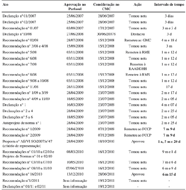 Essa constatação empírica comporta exceções bastante significativas. Nos casos em que não houve tão-somente uma tomada de nota, mas sim a efetiva aprovação do ato, o CMC não respeita a lógica temporal supramencionada. É o caso da Recomendação n° 16/10 que, apesar de ter sido aprovada a tempo de ser incluída na reunião de 16 de dezembro de 2010, somente foi aprovada em 28 de julho de 2011. Isso também ocorreu com a Proposta n° AE/VI SO/2007/N°47, relativa ao critério de representação cidadã, que demorou quase um ano e meio para ser aprovada. Observa-se, então, que o imediatismo na inclusão de um ato na pauta não necessariamente significa que ele será efetivamente analisado. Na verdade, há fortes indícios de que a aprovação segue um rito oposto, de atraso na discussão e aprovação. Isso levaria a pensar que quanto maior a rapidez de inclusão do ato do Parlasul na agenda do CMC, menor a probabilidade de que o CMC tome medidas para o cumprimento da demanda dos parlamentares. De toda sorte, dado o baixo índice de aprovação e discussão pelo CMC dos atos do Parlasul, conclui-se que o parlamento pouco influencia na agenda do órgão decisório por meio de mecanismos formais.