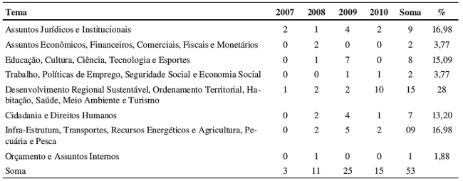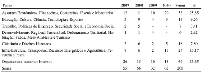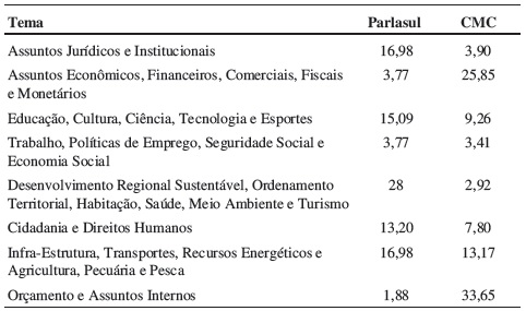 Para verificar o poder de agenda informal, compararam-se as agendas do Parlasul e do CMC. Na análise da agenda do Parlasul, procedeu-se à classificação das recomendações de acordo com os temas das comissões parlamentares. Isso não significa necessariamente que os atos foram oriundos dessas comissões (a origem da proposta não está especificada no documento), mas sim que o tema da recomendação enquadra-se nas competências da comissão. Somente foram considerados os atos aprovados em plenário, e não a totalidade das propostas discutidas. Quanto aos assuntos mais abordados no Parlasul, há uma relativa distribuição temática. A maioria das recomendações está relacionada a Desenvolvimento regional sustentável, ordenamento territorial, habitação, saúde, meio ambiente e turismo, seguida por Infraestrutura, transportes, recursos energéticos e agricultura, pecuária e pesca. Observa-se a pouca aprovação de resoluções que discutem assuntos econômicos, financeiros e comerciais, questão de fundamental importância em um modelo de integração liberal. Ao praticamente ignorar a temática econômica, o Parlasul deixa de tentar influenciar em uma questão sensível do bloco. Pode-se argumentar que o Mercosul possui órgãos executivos especializados na regulação econômica e comercial, e por isso o Parlasul poderia se manter alheio a elas. No entanto, o escrutínio e o debate pelos parlamentos de todos os assuntos de interesse da sociedade constituem bases da democracia contemporânea. A Tabela 2 analisa as aprovações de recomendações de acordo com o assunto.