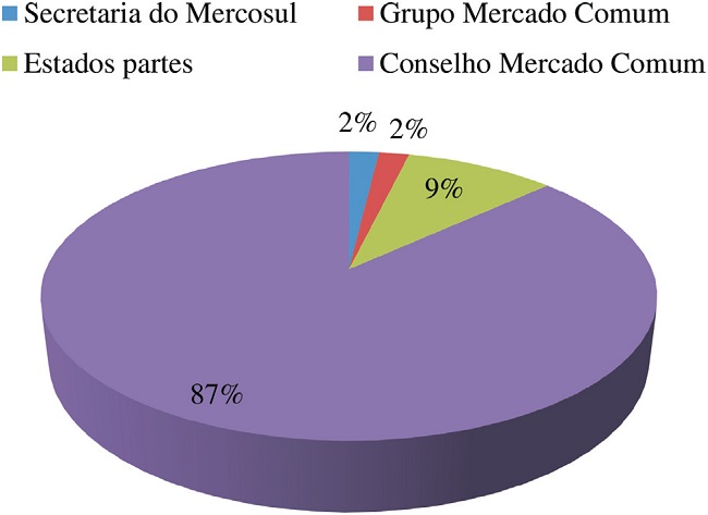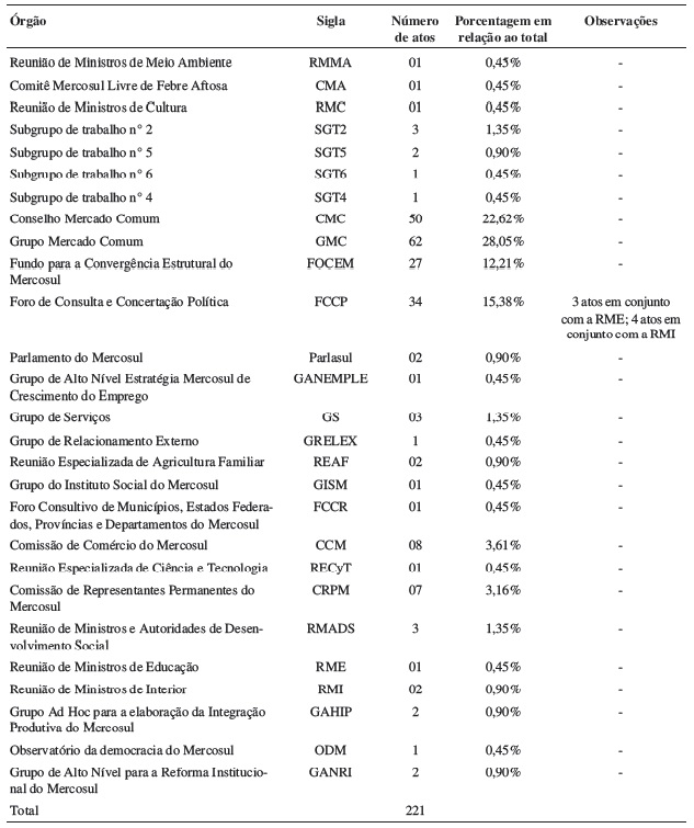 Do problema específico do Parlasul, a saber, a dificuldade em influenciar a agenda do CMC, surge um mais geral: afinal, quais são os órgãos do Mercosul dotados de um forte poder de agenda? A partir dessa questão, analisou-se a aprovação de decisões no CMC entre os anos de 2007 e 2010, tendo como foco o órgão em que se originou o ato normativo ( Tabela 5).