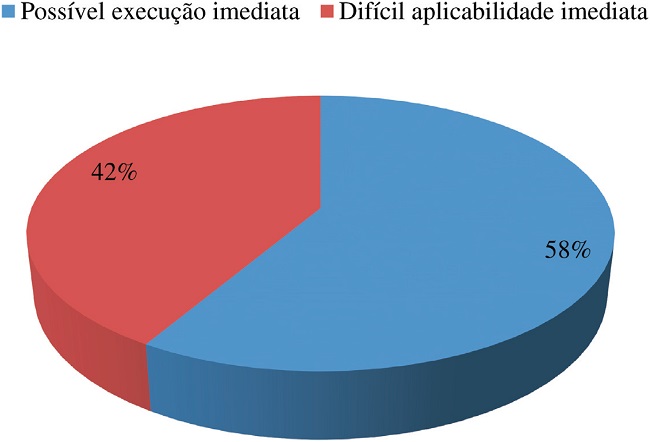 Com respeito à execução das resoluções propostas pelo Parlasul, constatou-se que, em 58% dos casos, é possível sua implementação imediata ( Gráfico 2). Isso significa que a medida não exige um grande esforço de negociação entre os Estados Partes, uma vez que a negociação já aconteceu em outro âmbito. Assim, o documento enviado pode ser imediatamente aprovado. É o caso da Recomendação n° 07/08, que sugere a assinatura da Convenção dos Direitos das Pessoas com Deficiência. Ora: não se trata de um tema que engendre grandes polêmicas, e a recomendação somente requer assinatura e ratificação – e não cumprimento – de um documento já discutido na Assembleia Geral das Nações Unidas. Por sua vez, a Recomendação n° 09/2010 pede ao CMC que estabeleça medidas de controle para as atividades de caça, pesca, extração de madeira e introdução de gado em áreas protegidas limítrofes. Como o documento não expressa quais seriam as medidas a serem tomadas, o CMC precisa remeter a questão ao Subgrupo do GMC responsável pela matéria para sua regulamentação. Isso faz com que a recomendação não possa ter uma aplicabilidade imediata.