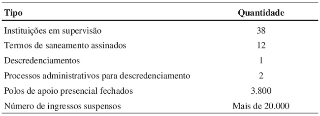 Durante o governo Lula, foi realizada uma grande investida de ações de supervisão nos cursos superiores de Direito e na educação a distância. Segundo dados oficiais, até março de 2010, 89 cursos passaram pela supervisão e cerca de 20.000 vagas foram suspensas. Dois cursos foram fechados (MEC 2010). No caso da educação a distância, os números da supervisão, segundo dados de 2010 são exibidos na Tabela 1.