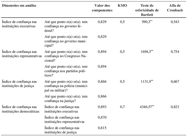 Com base na análise fatorial, foram construídas quatro variáveis: 1) índice de confiança nas instituições executivas, resultado do somatório do grau de confiança nos governos municipais e federal; 2) índice de confiança nas instituições representativas, resultado do somatório do grau de confiança no Congresso Nacional e nos partidos políticos; 3) índice de confiança nas instituições de justiça, resultado do somatório do grau de confiança na polícia e no judiciário; e 4) índice de confiança nas instituições democráticas, resultado do somatório do índice de confiança nas instituições executivas, representativas e de justiça.