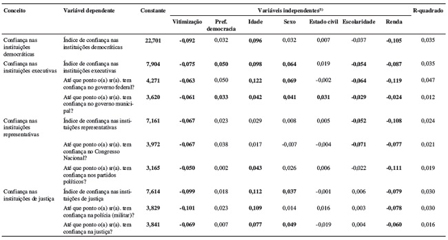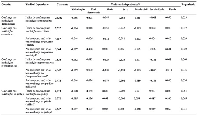 Uma vez escrutinadas as variáveis dependentes, independentes e de controle, o passo seguinte foi a construção de modelos de regressão linear múltipla para estimar os efeitos da vitimização por crime na confiança nas instituições democráticas, controlando-se pela preferência pela democracia e pelas características pessoais dos respondentes. De modo esquemático, a equação pode ser descrita da seguinte forma: