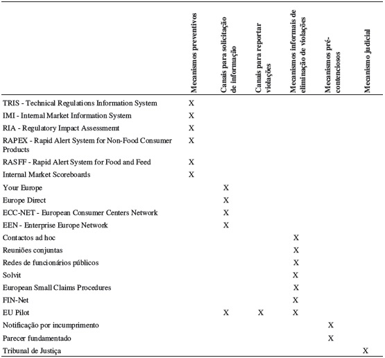 Héritier (1999) considerava, no final da década de 1990, que a UE poderia usar processos informais para tratar o incumprimento ( issue linkages, package deals, compromissos e concessões ou até mecanismos de compensação) e melhor atender às preferências e interesses distintos dos Estados membros que levavam a situações de incumprimento. Mais recentemente, Chen & Novy (2011) consideravam que havia ainda espaço de governação na UE para reduzir estas barreiras de acesso ao mercado que resultam do incumprimento da liberdade de circulação de bens. É a multiplicidade de mecanismos e canais de governação que existe presentemente na União Europeia e as suas respetivas funções que apresentamos na Tabela 1.