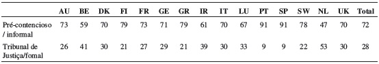 A partir da análise de uma base de dados disponibilizada pela Comissão Europeia 2, propomo-nos analisar a forma como a Comissão e os Estados membros tratam a resolução dos procedimentos de infração referentes à liberdade de circulação de bens, as quais designamos de infrações protecionistas pois elas têm como consequência a proteção dos mercados domésticos da concorrência externa. A base de dados contém 2319 casos, reporta-se à UE15, e cobre o período 1965 a 2002, altura em que foi descontinuada face à aposta da Comissão num instrumento informal para resolução de violações no mercado único, o Solvit. A análise dos resultados confirma a preferência por métodos pré-contenciosos de resolução das infrações de cariz protecionista: das queixas apresentadas à Comissão só 28% são alvo de uma ação judicial por incumprimento junto do TJE, sendo os restantes 72% resolvidos na fase pré-contenciosa ( Tabela 2). Em alguns Estados membros esta preferência pela resolução das infrações no nível pré-contencioso é ainda mais acentuada: Portugal e Espanha são os países que registam a maior percentagem das infrações resolvidas na fase pré-contenciosa (91%). Os Países Baixos têm a maior percentagem de casos enviados ao TJE (54%).