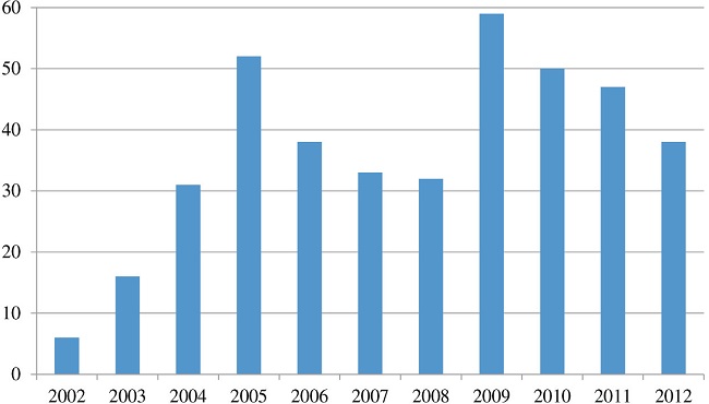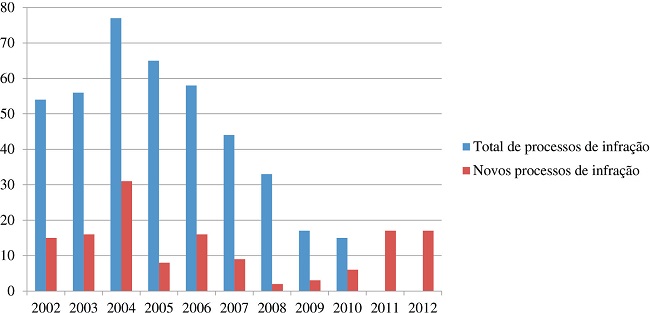 Fonte: A autora, a partir dos Annual Reports on Monitoring the Application of EU Law. Comissão Europeia (2002-2012).