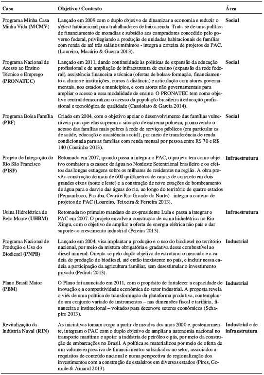 Foram selecionados oito planos, programas ou projetos federais criados (reformulados ou expandidos) no período entre 2003 e 2013 e considerados emblemáticos dos governos dos presidentes Lula e Dilma. Os casos selecionados foram: o Programa Minha Casa Minha Vida (MCMV), o Programa de Integração da Bacia do Rio São Francisco (PISF), o Projeto da Usina Hidrelétrica de Belo Monte (UHBM), o Programa de Revitalização da Indústria Naval (RIN), o Programa Nacional de Produção e Uso do Biodiesel (PNPB), o Plano Brasil Maior (PBM), o Programa Bolsa Família (PBF), e o Programa Nacional de Acesso ao Ensino Técnico e Emprego (PRONATEC). As informações a respeito de cada um dos oito casos foram extraídas de estudos previamente publicados, conforme Quadro 1, o qual também expõe sumariamente os objetivos dos programas, seus contextos de criação e a área temática a que se vinculam.