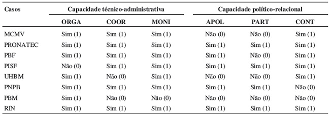 Portanto, a análise no interior dos casos confirma e detalha as associações encontradas entre as capacidades técnico-administrativas e entrega de produtos: a combinação de organizações profissionalizadas com mecanismos de coordenação eleva as capacidades técnico-administrativas; já a ausência de tais condições reduz essas capacidades.