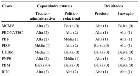 A Tabela 2, por sua vez, apresenta os casos em termos das capacidades (técnico-administrativas e político-relacionais) geradas pelos arranjos institucionais, como também em termos de seus resultados (produtos e inovação). Para classificar as dimensões técnico-administrativas e político-relacionais dos oitos casos, adotou-se o seguinte critério: se na dimensão de capacidade em questão verificou-se a presença de três das três condições analisadas, ela é classificada como alta; se duas das três condições são verificadas, a dimensão é considerada como média; e se uma ou nenhuma condição está presente, a dimensão é avaliada baixa. Por exemplo, o programa MCMV teve a capacidade técnico-administrativa classificada como Alta (ou 2), por ter sido verificado a presença de todas as três condições analisadas nesta dimensão (ORGA, COOR e MONI), mas teve a capacidade político-relacional classificada como baixa por ter sido verificada a presença de apenas uma das três condições avaliadas (CONT), conforme pode ser observado na Tabela 2.
