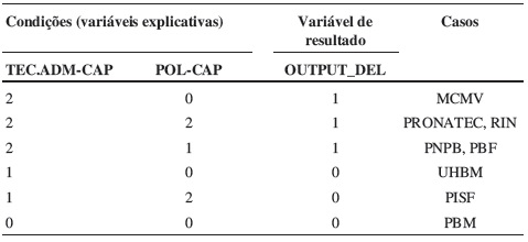 A Tabela 3 apresenta seis tipos de configurações de casos, cada qual correspondendo a um ou dois casos. Três configurações estão associadas à variável de resultado com valor 1 (alta entrega de produtos) e três configurações à variável de resultado com valor 0 (baixa entrega de produtos).