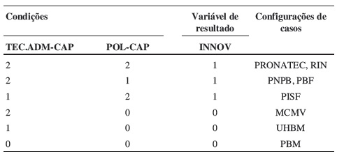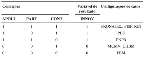 A Tabela 4, por sua vez, também possui três configurações de casos para a variável de resultado 1 (alta inovação) e três configurações de casos para a variável de resultado zero (baixa inovação).