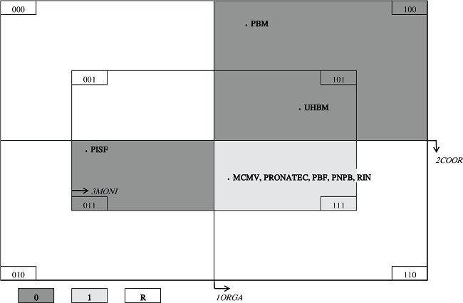 O Diagrama de Venn ( Figura 2) fornece uma visualização dessas configurações de condições e resultados. Nele, os casos que apresentam altas entregas de produtos (valor igual a “1” na variável OUTPUT_DEL) estão todos situados na região do diagrama que expressa a intercessão, ou presença simultânea, das três condições – ORGA, COOR e MONI (com valores igual a “1”). Os demais casos (PISF, UHBM e PBM) estão situados em outras regiões do gráfico, as quais expressam a ausência de uma ou duas das três condições analisadas. Essas regiões do diagrama, por sua vez, apresentam-se associadas com a baixa entrega de produtos (OUTPUT_DEL igual a “0”).