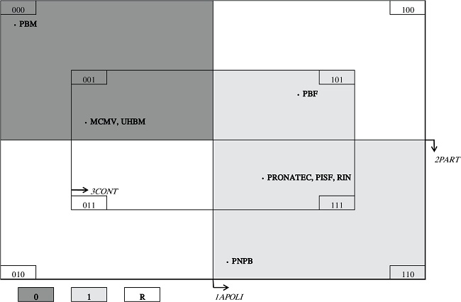 Como mostra o Diagrama de Venn a seguir ( Figura 3), três casos (PRONATEC, PISF e RIN) que apresentaram inovações se situam na região do gráfico caracterizada pela presença simultânea das três condições em análise: APOLI (interação com agentes políticos), PART (presença de mecanismos de participação social) e CONT (interação com órgãos de controle). Os outros dois casos que envolveram inovações, PBF e PNPB, são caracterizados pela presença de apenas duas destas condições. O PBF se situa na intercessão de CONT e APOLI. Já no caso do PNPB, tem-se a intercessão de APOLI e PART. Assim, em conjunto, estes cinco casos podem ser explicados pela presença simultânea de agentes políticos (APOLI) e os órgãos de controle (CONT) ou pela presença simultânea de agentes políticos (APOLI) e mecanismos de participação (PART), como mostra a área do diagrama marcada em correspondência ao valor “1” (para a variável “inovação”). Quando pelo menos duas destas condições são simultaneamente ausentes (APOLI e PART = 0), o resultado associado é de baixa inovação na política (tal como nos casos do MCMV, UHBM e PBM).