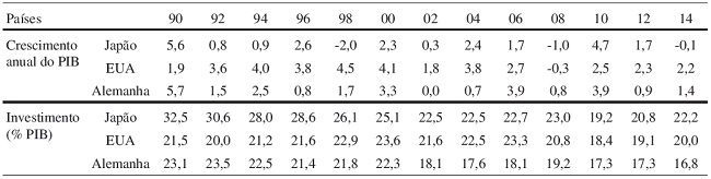 Contextualizando a crise, a Tabela 1 apresenta uma comparação do desempenho das variáveis investimento e crescimento anual (%) do Produto Interno Bruto (PIB) entre as economias japonesa, americana e alemã no período 1990 a 2014.
