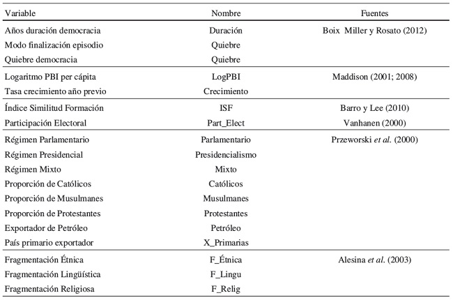 Asimismo se controló la influencia que podrían tener otros factores en el quiebre de las democracia, como son por ejemplo la fragmentación étnica, la fragmentación lingüística y también la religiosa de la población de cada país, según cálculos originales de Alesina et al. (2003) 19. También los niveles de participación electoral fueron tomados como variable de control según datos obtenidos de Vanhanen (2000). Además, tanto los modelos con efectos fijos como los sencillos incluyeron como variables de control los niveles absolutos de producto per cápita, así como sus tasas de crecimiento. Los datos respecto a los niveles de producto y sus tasas de crecimiento fueron obtenidos de la base de datos de Angus Maddison (2008) que cubre todo el período de estudio. En el Cuadro 1 se detallan las variables relevadas y la fuente de datos correspondiente en cada caso.