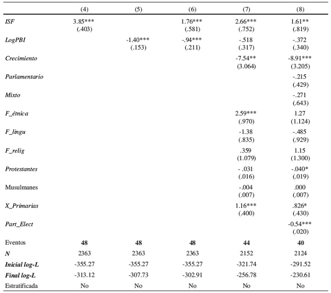 Distintas estrategias de control fueron empleadas para estimar la incidencia del ISF sobre la duración de las democracias. El primer factor a controlar es el nivel de producto per cápita, que ha sido señalado como la variable más importante para explicar las probabilidades de quiebre de una democracia ( Przeworski et al., 2000 ) 16. Para controlar la influencia del PBI debe diseñarse una estrategia especial, pues el ISF y el PBI están correlacionados y los coeficientes de estas variables estarán sesgados cuando ambas se incluyen simultáneamente en un mismo modelo (aunque el ajuste total que arroje el modelo es siempre completamente confiable).