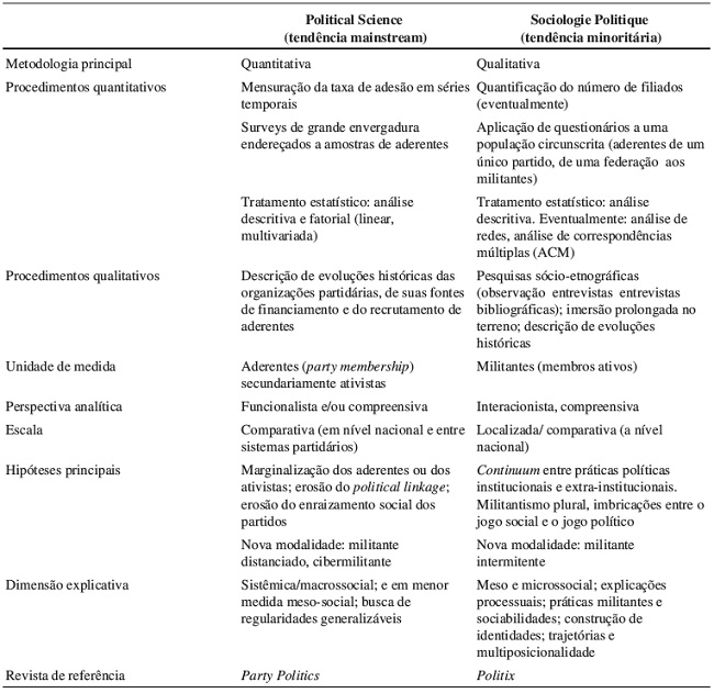 A literatura recente sobre a participação político-partidária encontra-se atravessada por embates epistemológicos e metodológicos que apontam à estruturação de dois campos de produção compartimentados. Na falta de uma melhor nomenclatura, elegemos denominá-los, por um lado, como uma tradição “Political Science”, de inspiração anglo-saxônica e que se afirma como tendência mainstream e, por outro lado, como uma tradição de “Sociologie Politique” desenvolvida na França, que goza de menor influência internacional. Indubitavelmente, estas tradições não são homogêneas, estando atravessadas por debates e tensões entre correntes internas, alguns dos quais serão retomados ao longo deste ensaio. Entretanto, seus traços distintivos sustentam nossa esquematização, pois, embora se consagrem a explicar um mesmo fato social podendo, por vezes, repousar sobre problemáticas iniciais relativamente análogas, cada campo desenvolveu seus próprios protocolos de pesquisa, elaborou suas perguntas específicas, e dispõe de seus próprios universos de referências bibliográficas.