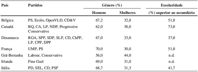 Ainda que a agregação em nível nacional e a comparação entre distintos sistemas políticos traga um risco de aplanar as especificidades partidárias, selecionamos duas variáveis (gênero e escolaridade) para esboçar algumas tendências atuais ( Tabela 1). Uma primeira olhada nos resultados dos trabalhos recentes mostra a predominância masculina no perfil dos aderentes partidários, com a percentagem de homens oscilando desde 62% nos partidos canadenses até 70% nos franceses, enquanto que nos partidos britânicos há praticamente uma paridade (em razão da grande proporção de mulheres presentes no Conservative).