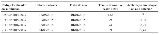 A Tabela 1 contém duas informações relevantes. Logo de saída percebe-se a expansão contínua na quantidade de submissões espontâneas, pois o tempo decorrido até a chegada da trigésima sétima submissão sempre tem sido inferior em relação ao ano anterior. Isso significa que o fluxo de tarefas se acelerou, e deve tomar mais energia do comitê editorial. Em 2014, quando todos os artigos submetidos para nossa avaliação chegaram via ScholarOne®, o tempo decorrido até a 37ª submissão foi de 132 dias, mais do que o dobro dos 59 dias observados em 2017 (a razão, em termos percentuais, é de 223,7%).