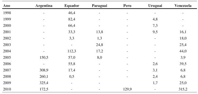 Outro país relevante nesta análise, o Equador, tem uma sequência significativa de recursos continuados, o que demonstra interesse do empresariado brasileiro em investir naquele país. Diante dos problemas de infraestrutura de transporte e de energia26, o governo de Quito buscou os serviços de empreiteiras brasileiras para levar a termo seu programa de obras integradoras. O fluxo de investimentos do Brasil para esse país é drasticamente interrompido em 2008 por conta da crise internacional; mais ainda pela ameaça do governo Correa de não honrar seus compromissos com o Brasil e como consequência da decisão de banir a Odebrecht27.