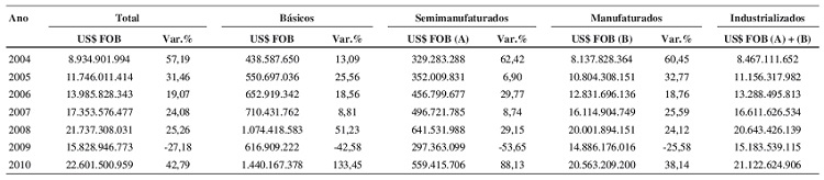 Do ponto de vista mais propriamente comercial, a América do Sul ganha, na última década, expressão dentro da estratégia da PEB. Esse grupo de países oferece para o Brasil um destino seguro para uma parcela considerável da sua produção industrial. Contrariamente ao que se processa com a pauta de exportações brasileiras com seus maiores parceiros fora da região (China, EUA e Japão), onde as maiores parcelas dos ganhos são provenientes da venda de commodities (principalmente nas trocas com os países asiáticos), no comércio com os países do Mercosul e com outros vizinhos o superávit decorre do comércio de produtos manufaturados. A pauta comercial do Brasil possui uma considerável presença de países sul-americanos, principalmente no que tange às exportações. Deste modo, o Mercosul tem um papel estratégico para a atividade industrial brasileira. A situação das exportações brasileiras para o Mercosul verificada nos últimos anos pode ser vista através da Tabela 3.