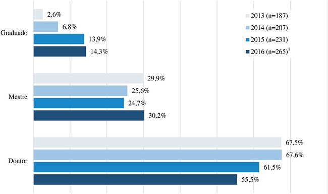 Os Gráficos 1, 2 e 3 apresentam informações mais detalhadas sobre essa comunidade. Primeiro expomos informações sobre a titulação acadêmica, depois suas áreas disciplinares e por último sua distribuição geográfica.