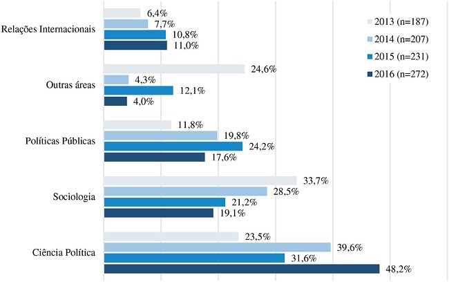 O Gráfico 2 revela que em 2016 quase metade dos autores que nos procuraram estavam vinculados a programas de pós-graduação em Ciência Política. Esse perfil é o que mais se expandiu em relação à 2015, passando de 31,6 para 48,2 pontos percentuais. Autores vinculados a Programas de Relações Internacionais se estabilizaram nesses dois anos (10,8% e 11%), ao passo que temos sido cada vez menos acionados por autores vinculados institucionalmente a Programas da área de Sociologia, Políticas Públicas e outras áreas de conhecimento.