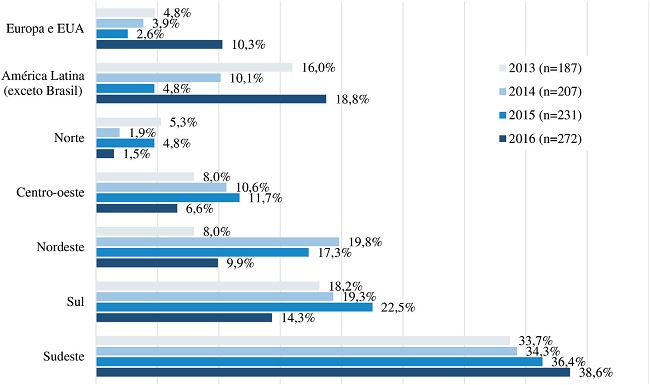 Os dados presentes no Gráfico 3 revelam uma impressionante expansão da participação de pesquisadores estrangeiros na população dos autores que submetem espontaneamente seus artigos para nosso periódico. Praticamente um terço daqueles que submeteram artigos em 2016 são vinculados a instituições da América Latina, Europa e EUA. Ao comparar as barras do ano anterior, no Gráfico 3, percebemos que o contingente de estrangeiros está tomando espaço dos autores provenientes das regiões norte, nordeste e centro-oeste, pois somente aumentou o percentual de autores vinculados a universidades na região sudeste.