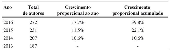 A Tabela 1 apresenta a expansão do universo de autores que submeteram artigos nos últimos quatro anos ao nosso periódico. Em 2016 fomos procurados por 272 autores, um valor 17,7% mais elevado do que os 231 autores que submeteram seus artigos em 2015. Essa elevação reafirma uma tendência verificada nos últimos tempos, já que a nossa comunidade vem se expandindo de modo regular. Partindo de 2013 como base para comparação, o crescimento acumulado da população de autores no quadriênio foi de 39,8%.
