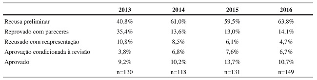 A Tabela 2 indica que 10,7% (dezesseis artigos) dos manuscritos recebidos em 2016 foram aprovados para publicação. Somando com os dez artigos (6,7%) que receberam decisões de aprovação condicionada à revisão2, conclui-se que a taxa de aprovação em 2016 foi de 17,4% (ou seja, 26 artigos no total de 149 submissões avaliadas). A taxa de recusa em análise preliminar (sobre a qual tratamos no editorial de junho do ano passado, publicado no vol. 24, n.58) se mantém estável na faixa dos 60%.