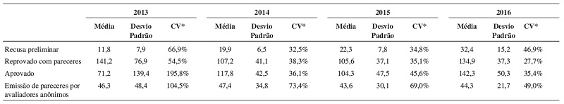 A Tabela 3 apresenta o tempo dispensado na tomada de decisão. Em 2016 o tempo médio para aprovação de um manuscrito foi de 142,3 dias, e o tempo médio para a decisão pela reprovação com base em pareceres anônimos foi de 134,9 dias. O desvio padrão para a tomada dessas decisões em 2016 não foi tão alto (50,3 e 37,3, respectivamente) se levarmos em conta a quantidade de pareceres emitidos. O indicador de dispersão no tempo de tomada de decisão que vem sendo empregado nos últimos anos é o coeficiente de variação, e esse indicador também se manteve razoavelmente baixo no caso dos artigos que foram enviados para avaliação externa (os valores são de 35,4% para os artigos aprovados e 27,7% para os textos recusados com pareceres). Isso ocorre porque a maioria das decisões pela aprovação ou pela rejeição foram tomadas mais ou menos no mesmo tempo (cerca quatro meses).