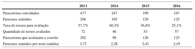 A Tabela 4 resume os indicadores acerca do processo de arbitragem. Durante o quadriênio foram emitidos 627 pareceres para 228 artigos. Ao longo dos quatro anos enviamos 1.081 convites para a emissão de pareceres (545 dos quais foram aceitos). Vale destacar que em 2016 registramos a menor quantidade de pareceres emitidos por texto (2,19) no quadriênio, o que indica a convergência de avaliações no processo de arbitragem ao longo do quadriênio. É razoável que eventualmente ocorra um desacordo entre o parecerista 1 e o parecerista 2 e nessas situações o parecerista 3 é chamado para esclarecer os editores acerca da decisão a se tomar. Contudo, se for necessário acionar mais do que três pareceres para decidir pela publicação ou não, então somos obrigados a concluir que ou não escolhemos corretamente os pareceristas, ou um dos pareceres foi insuficiente, ou os artigos não deveriam ter passado no processo de avaliação preliminar.