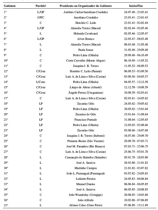 Examinam-se agora os motivos políticos dos afastamentos de cada um dos ministérios, seguindo-se ordem cronológica. A Tabela 1 lista os gabinetes do Segundo Reinado, especificando coloração partidária, chefe do ministério e o seu início e fim.