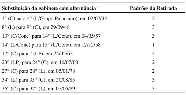 Já substituições de gabinetes classificadas como decorrentes de deliberações exclusivas do trono (padrão 2) acontecem seis vezes sob o regime inicial de listas, duas vezes perante os círculos (de 1 e de 3), uma vez sob a Lei do Terço e outra vez na vigência da Lei Saraiva.