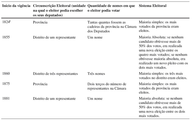 A introdução das “eleições diretas”, no início da década de 1880, via Lei Saraiva, marcaria, por fim, o retorno às fórmulas majoritárias uninominais (“distritalizadas”), com maioria absoluta. Sob essa regra se elegeram os parlamentares das últimas quatro legislaturas do Império.