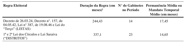 Assim, com a legislação de listas em bloco, o tempo de permanência média no poder dos ministérios que governaram diante de câmaras escolhidas por aquele regime foi de 17,45 meses, contra 14,65 meses dos gabinetes que se relacionaram com legislativos “distritalizados”, agora também agrupados para efeito do cálculo dicotomizado. Ao governar frente a câmaras baixas “distritalizadas”, as equipes ministeriais do Segundo Reinado tiveram encurtados seus mandatos em algo próximo a 16% do tempo quando comparadas às formações que dependeram de legislaturas de listas.