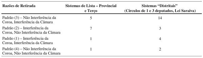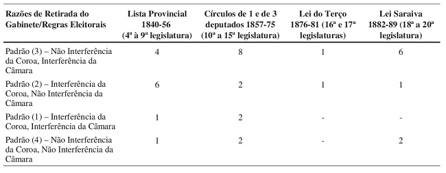Nesse sentido, vê-se que afastamentos por interferência exclusiva da Câmara (padrão 3) ocorrem quatro vezes sob legislaturas eleitas por listas provinciais (1840-1856), oito vezes diante de Câmaras regidas pelos Círculos (de 1 e de 3), uma vez perante um corpo parlamentar eleito sob a Lei do Terço e seis vezes frente a deputados provenientes do regime eleitoral da Lei Saraiva (distrito de um e eleição em grau único).