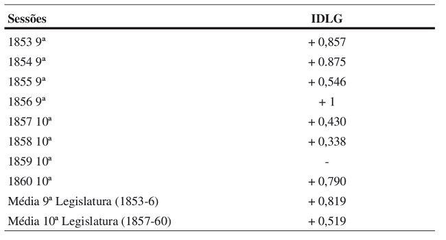 Examinadas as sessões anuais constitutivas das duas legislaturas em foco e aplicado o método exposto, verificam-se os resultados compilados na Tabela 7, os quais especificam os IDLGs por sessão e as suas médias por legislatura38.