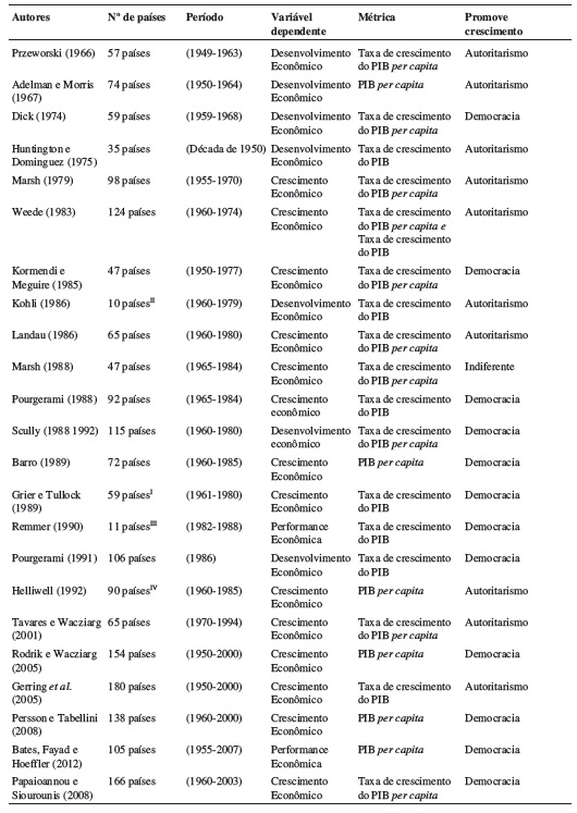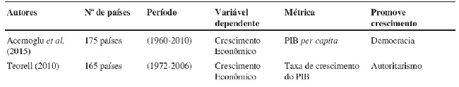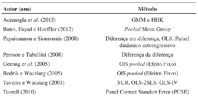 O Quadro 1 apresenta algumas pesquisas empíricas referenciadas nas últimas décadas que relacionaram regimes democráticos e crescimento econômico. Por sua vez, o Quadro 2 evidencia os métodos de estimação adotados nos últimos trabalhos empíricos sobre o tema.