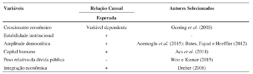 Destarte, as relações de causalidades esperadas entre as variáveis aqui selecionadas estão expostas no Quadro 3.