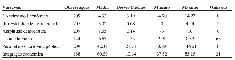 Com o objetivo de mapear evidências empíricas de uma possível relação entre democracia e crescimento econômico na região, foram selecionados 21 países latino-americanos: Argentina, Bolívia, Brasil, Chile, Colômbia, Costa Rica, El Salvador, Equador, Guatemala, Guiana, Honduras, Jamaica, México, Nicarágua, Panamá, Paraguai, Peru, República Dominicana, Suriname, Uruguai e Venezuela. A seleção destes países se deu pela relevância regional e/ou pela disponibilidade de informações consolidadas para o período estudado. Por sua vez, o corte longitudinal da pesquisa, que contemplou os anos de 2004 a 2013, objetivou contemplar uma fase de relativo equilíbrio macroeconômico para boa parte dos países da amostra. O banco de dados foi construído em formato de painel balanceado, perfazendo 209 observações, com N = 21 e T = 10, porém, com gaps.