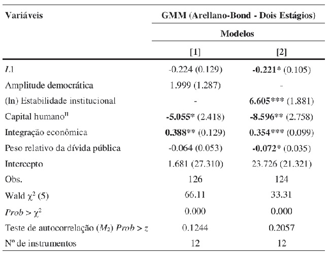 Por outro lado, no Modelo 2 a variável estabilidade institucional mostrou-se estatisticamente diferente de zero e com sinal positivo esperado, ao nível de significância inferior a 1%. A estabilidade das instituições formais de regulação política, ou seja, ausência de rupturas nas regras de distribuição de poder entre grupos societais, no tempo, impacta positivamente, e com elevado nível de robustez, o desempenho econômico na região, promovendo crescimento do PIB, para além do regime político em vigor (democracia ou autoritarismo). Assim, considerando que uma variação no logaritmo de um número é uma variação relativa, o aumento de 1% no grau de estabilidade política na América Latina gera, em média e ceteris paribus, um impacto de 6,6% sobre a taxa de variação percentual do desempenho econômico nos países da região12. Os resultados da estimação expressa no Modelo 2, portanto, sugere apoio empírico para a hipótese H2.