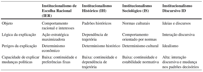 Por fim, para que o leitor possa ter uma visão panorâmica e comparativa das diferenças entre o institucionalismo de escolha racional (IER), o institucionalismo histórico (IH), o institucionalismo sociológico (IS) e o institucionalismo discursivo (ID), apresentamos suas principais características no Quadro 1.