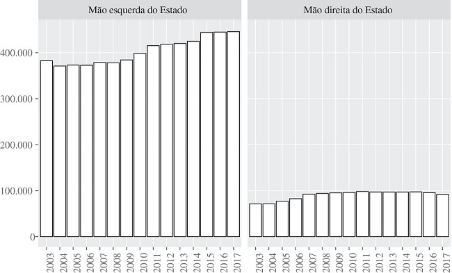 O Gráfico 1 mostra o quantitativo total de membros em cada um dos segmentos, revelando a superioridade numérica dos membros da mão esquerda do Estado. Para cada membro da mão direita do Estado, há cerca de quatro membros da mão esquerda.