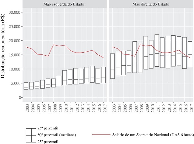 A ilustração permite observar que o período analisado foi caracterizado por um aumento remuneratório em termos reais em ambos os segmentos. Também é possível verificar que a remuneração mediana das carreiras da mão direita do Estado se mantém consideravelmente superior à remuneração mediana das carreiras da mão esquerda do Estado. Em 2003, enquanto a remuneração mediana das carreiras da mão esquerda não chegava a R$ 5 mil, as carreiras da mão direita estavam próximas de R$ 10 mil. Em 2017, apesar dos aumentos, a relação desigual se mantém, com as carreiras da mão esquerda recebendo uma remuneração mediana de cerca de R$ 7 mil e as carreiras da mão direita chegando aos R$ 15 mil.
